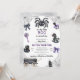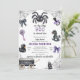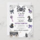 Little Boo Itsy Bitsy Spider Halloween Baby shower Invitation - Un petit livre est presque attendu! Cette adorable et super mignonne invitation baby shower est l'invitation parfaite pour un baby shower d'Halloween. Doté d'une mignonne araignée noire aux accents de toile d'araignée et d'adorables articles pour bébé avec des motifs de toile d'araignée, y compris des arcs à coquette, un petit bétail, une biberon, un adorable chariot pour bébé, un canard en caoutchouc, un cheval à bascule et une tasse pour bébé. Dans la palette violet foncé et noir de couleur cet invitation baby shower est parfait pour la mère gothique d'être ou pour une douche de couple qui aime la goth et tout éffrayant. Disponible en tant qu'invitation de baby shower imprimable modifiable ou en tant que téléchargement numérique instantané, envoyez-le par e-mail, texte ou médias sociaux. Donnez le ton pour un baby shower d'Halloween éffrayant et mignon avec cette petite invitation de baby shower d'araignée bitsy.