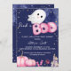 Petit boo Halloween mignon bébé fantôme rose baby shower modèle invitation instantanément télécharger pour un baby shower bébé filles. Un mignon fantôme rose citrouille à l'aquarelle chandelles sur une nuit étoilée foncée arrière - plan pour le baby shower des filles à thème Halloween.