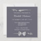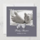 Une élégante invitation neutre pour l'baby shower entre les sexes avec une photo en noir et blanc de nouveau-nés pieds de bébé toujours vêtus des bandes d'hôpitaux encadrés contre un arrière - plan gris lavande et agrémentés de feuilles classiques en fibre et d'un ruban d'argent attaché dans un arc. Personnalisez ce baby shower en ajoutant le nom de la nouvelle mère.