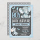 Animaux de la jungle des éléphants et des zèbres, invitation baby shower garçon bleu et gris. Couleurs bleues et grises.