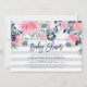 Cette invitation au baby shower chic et branchée présente des feuilles et des fleurs couleur rose pastel et bleu marine, avec des rayures douces et grises. Nous avons utilisé l'art de LABFcreations et IndieGrace Design.