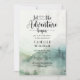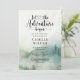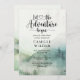 Laissez l'aventure commencer par thème baby shower d'aquarelle invitation avec forêt et montagnes paysage sauvage dans la brume, avec typographie de script de calligraphie. Ethérée et magique.
