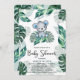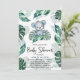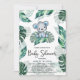 L'invitation à la douche pour bébé garçon comprend un mignon bébé d'aquarelle sur un cadre tropical feuille et tropical. Personnalisez avec vos détails dans des lettres de majuscules en bloc tendance.