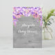 Invitations de douches bébé personnalisées dans un motif en bois gris rustique et joli violet d'aquarelle lilas fleurs vintages. Parfait pour un baby shower de printemps ou d'été.