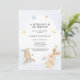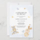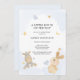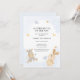 Un petit garçon est sur la route des garçons baby shower invitation avec nounours mignons, étoiles, demi lunes, coussins coeur pastel amour, et arrière - plan roux.