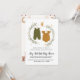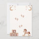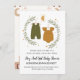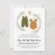 La première image est une invitation baby shower pour les jumeaux, avec un design chaleureux et élégant dessiné à la main Au centre, deux tenues de bébé sont accrochées sur des cintres en bois : Un romper vert foncé pour le bébé, avec des boutons avant. Une tenue marron-orange pour la petite fille, avec manches courtes et boutons rouillés. Autour des tenues, une couronne de branches vertes formant une forme circulaire, décorée de petites étoiles dispersées. Au sommet, on voit l'illustration d'une lune souriante au croissant de soleil, entourée de douces rayons. Ci-dessous, le texte est écrit dans une police élégante en vert et en brun, fournissant des détails sur l’événement, y compris le nom de la mère, la date, l’emplacement et les informations du registre des cadeaux. Le logo de "l'île aux salutations" se trouve en bas à droite. Le design utilise des tons chauds et terreux comme le vert d'olive, le brun et l'or, créant une atmosphère confortable et accueillante parfaite pour l'occasion.