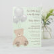 Un petit ourson sur le chemin baby shower invitation comprend un ourson en peluche couleur aquarelle et des ballons dans le brun et vert neutre genre. Le dos de l'invitation a des rayures d'aquarelle diagonales et des blocs de bébé.