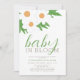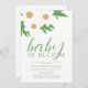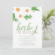 Cette invitation de baby shower marguerrier est idéale pour une célébration de baby shower sans sexe, pour un bébé garçon ou une fille. Il est décoré de marguerites dessinées à la main et de feuilles et dit Baby in Bloom dans la typographie stylisée. Dessin original © Michele Davies.