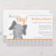 Une invitation orientée moderne de baby shower d'éléphant gris et orange. Perfectionnez pour un baby shower de petit garçon.