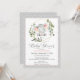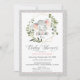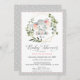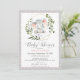Aquarelle en rose et gris entourée d'un prisme géométrique à l'aspect doré, avec feuillage d'eucalyptus au-dessus de la conception de la carte d'invitation de baby shower de polka-point gris arrière - plan.