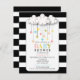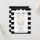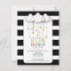 Une invitation baby shower moderne avec une illustration de nuages de coeur sur un arrière - plan rayé noir et blanc.