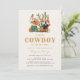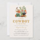 Invitation au Baby shower occidental de Cowboy. Célébrez votre petit cow-boy à venir avec ce charmant A Little Cowboy est sur le chemin Western Invitation, conçu pour mélanger le charme rustique de l'ouest avec l'excitation sincère. Magnifiquement détaillé avec des bottes de cowboy aquarelées peintes à la main, des cactus du désert et des motifs rodéos classiques dans des neutrales terrestres, des oranges riches, des roses subtiles, des accents d'or et de noir, cette invitation est parfaite pour une douche à thème occidental neutre pour les hommes. Amène l'esprit du Far West à la vie et personnalise cette invitation pour la rendre aussi spéciale que le nouveau buckaroo que tu fêtes !