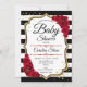 Invitation baby shower. Design élégant avec rayures noir et blanc et faux or parties scintillant. Caractéristiques police de script tendance, roses rouges et confetti. Parfait pour un Baby shower élégant.