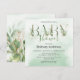 Invitation de baby shower botanique élégante avec un fond lavis aquarelle vert poussiéreux stylé, un beau feuillage vert enroulé autour des lettres qui épellent le mot "BÉBÉ", des accents de paillettes dorées et un modèle de célébration de baby shower facile à personnaliser.