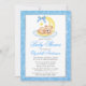 Aquarelle Teddy Bear sur la lune et nuages avec bleu arc Baby shower Invitation. Cadre Parties scintillant Bleu. Argent et texte bleu.