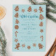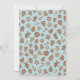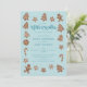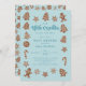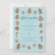 Carte d'invitation à baby shower à thème de Noël, lunatique et sucrée, avec illustration dessinée à la main de biscuits de vacances. Le texte dit "notre petit cookie est en route." L'arrière - plan est bleu et convient parfaitement pour un baby shower garçon.