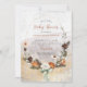 Une invitation à baby shower sur le thème des agrumes et des pins d'hiver avec un agrumes terreux, cadre de pin et de fleurs dans les teintes orangées et vertes brûlées.