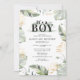 Invitation au baby shower animal safari de garçons sauvage, calme et élégant, avec girafe, effet or et feuilles verts. Parfait pour les invitations de baby shower garçon que vos invités aimeraient recevoir. Doté de feuilles de palmiers géants et de feuillage à effet or, ce design moderne avec un style élégant est facile à customiser pour créer une invitation unique de baby shower garçon pour vos besties de se joindre à vous pour célébrer la maman à être.
