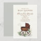 Ce design comporte une invitation baby shower aquarelle florale, élégant chariot vintage eucalyptus, avec un panier bunting mignon buggy victorienne, sexe neutre garçon botanique, avec un minimaliste minimaliste vieux mode moderne, idéal pour maman maman d'être, antique mignon whimsy style fun, un brun brun brun sage simple, moderne calligraphie script typographie, avec un arrière - plan vert grand grossesse nouveau bébé
