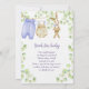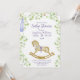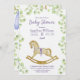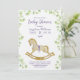 A baby shower invitation featuring cute baby clothes hanging on a line to dry, a cute stuffed bunny, an adorable rocking horse and all these items surrounded by delicate branches with light green leaves.