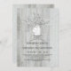 L'invitation de la fête de fiançailles en bois blanc rustique et élégant comprend des lampes à cordes, un bocal en maçon avec étiquette et initiales, et des fleurs de souffle de bébé.
