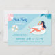 Ces simples invitations à la fête de la piscine de remise de diplômes sont sûrs de faire la fête d'été! Modèles de texte à l'avant et modèle photo à l'arrière. palmiers tropicaux en haut à droite, ballon de plage en haut à gauche, radeau de sauvetage et brune sur un tube intérieur flottant dans la piscine.