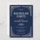 Invitation vos invités avec cette vintage invitation de Bachelor à thème Great Gatsby avec bordure décorative argent avec typographie élégante contre un arrière - plan bleu. Ajoutez simplement les détails de votre événement sur ce modèle facile à utiliser pour en faire une invitation unique. Retournez la carte pour révéler un motif d'étoiles d'argent au dos de la carte.
