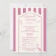 Célébrez en style avec ce Retro Pink Bow & Martini Bachelorette & Itinéraire Invitation, parfait pour la escapade de vos filles ou la fête de la bachelorette. Cette carte chic et élégante présente une illustration ludique en martini avec un doodle de fille cocktail, symbolisant l'esprit festif et amusant de l'événement. Le design est magnifiquement accentué avec un joli arc rose et un arrière - plan de rayures roses d'inspiration rétro, donnant à la carte une esthétique vintage mais moderne. Le recto de la carte présente les principaux détails de l'invitation, tandis que le verso présente un itinéraire détaillé, aidant les clients à rester organisés tout au long du week-end. Pour ajouter une touche spéciale et personnalisée, certaines parties de l'itinéraire sont laissées en blanc pour les notes manuscrites, vous permettant d'inclure des messages personnels, des rappels spéciaux ou des détails de dernière minute. Conçu avec un modèle de libellé facilement modifiable, cette invitation est simple à customiser avec vos détails d'événement, l'horaire et les informations sur les invités. Que vous soyez en train d'accueillir un bain au bord de la plage, une escapade chic de la ville ou un week-end spa relaxant, cette carte donne le ton parfait pour une aventure inoubliable en bachelorette. Sa palette de couleurs roses rétro et son design d'arc vintage apportent une touche d'élégance et de charme, ce qui en fait l'endroit idéal pour les mariées branchées et élégantes et leur équipe. Cette invitation est parfaite pour les invitations à la bachelorette rose, les invitations à la bachelorette rétro et les itinéraires de week-end de bachelorette. C’est aussi un endroit idéal pour les fêtes de spinster, les escapades de fin de semaine pour les filles et les annonces de bachelorette, donnant à votre célébration un look tendance et mémorable. La section itinéraires offre beaucoup d'espace pour lister les activités, les plans de repas et les points forts de la fête, en gardant tous les invités dans la boucle. Que vous l’envoyiez en tant que carte imprimée ou en tant qu’invitation électronique numérique, ce design polyvalent fonctionne pour n’importe quel format. Il est parfait pour les fêtes de fin de semaine de bachelorette, les voyages de filles et les fêtes d'avant-mariage amusantes, ce qui permet de partager facilement avec l'équipe entière. La combinaison de doodles fantaisistes, de rayures roses élégantes et d'une illustration ludique en martini ajoute une touche ludique, flirtante et branchée au design général. Idéal pour les invitations de bach, les annonces de bachelorette et les soirées de bachelorette évitées, cette invitation rend la planification de l'événement facile et élégant. Sa section d'itinéraire manuscrite ajoute une touche personnelle et charmante, ce qui fait que vos invités se sentent spéciaux et liés à la célébration. Faites de votre week-end de bachelorette un moment inoubliable avec ce Retro Rose Bow & Martini Bachelorette & Itinéraire Invitation, mêlant charme vintage et flair moderne. Parfaitement personnalisable et irrésistiblement élégant, c’est le meilleur moyen de lancer un week-end de rire, d’amour et de souvenirs de vie