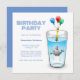 Invitation de fête d'anniversaire avec une jolie illustration d'une petite baleine. La baleine porte un casquette rayé rouge et blanc et a commencé la fête d'anniversaire qui a lieu dans un verre d'eau rempli.