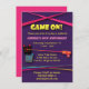 Une amusante invitation laser tag qui dit Game On! Les couleurs néons, les poutres laser, le pistolet à laser et les gilets sont représentés. Le thème violet et rose en fait un thème particulièrement girly. Personnalisez cette invitation pour la fête d'anniversaire d'une fille.