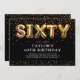 Invitation moderne de 60ème anniversaire avec un arrière - plan noir élégant, une diffusion de confettis de parties scintillant or, ballons d'hélium or qui épellent "soixante", et un élégant modèle de texte de fête qui est facile à personnaliser.