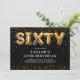 Invitation moderne pour 60e anniversaire avec un fond noir élégant, une dispersion de confettis dorés, des ballons en hélium dorés qui écrivent "soixante", et un modèle de texte de fête élégant facile à personnaliser.