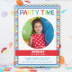 Invitation amusante et colorée, avec une phrase de temps de fête de lettres de ballon, votre photo préférée et un arrière - plan coloré est la combinaison parfaite pour une fête pour enfants