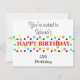 Fun anniversaire invitations à personnaliser pour n'importe quel âge. La façade est ornée de pois colorés et tendance, bleu turquoise, rose, jaune et noir contre un arrière - plan blanc éclatant. Le dos a un arrière - plan jaune avec des ballons volant rouges, bleus, verts, jaunes. Personnalisez avec les détails de votre fête. Designs originaux © TamiraZDesigns.