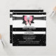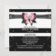Un seul arc noir et rose en faux satin bordé d'une bande dorée a une incrustation de diamant et est fixé contre un arrière - plan rayé blanc et noir bordé de parties scintillant en faux argent. Ce design chic et élégant est idéal pour une douche nuptiale. fête d'anniversaire ; un anniversaire spécial ou même un événement d'affaires. Personnalisez le libellé pour vous assurer qu'il convient à votre célébration spéciale.