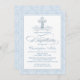 Boys bleu damask invitation baptism avec croix perle bleue et élégant script sur un joli bébé bleu damask arrière - plan. Cette élégante invitation au baptême damassé bleu est facilement customisée pour votre événement en ajoutant simplement vos détails dans le style et la couleur de police, et le libellé de votre choix.