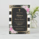 Elégante invitation au baptême de fille rayée noire et blanche avec roses roses rousses et croix d'or.