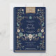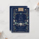 Cette invitation au baptême de marine et d'or est conçue pour ressembler à une vieille couverture vintage. L'invitation présente un élégant arrière - plan bleu marine aux motifs floraux d'or, lui donnant un aspect luxueux et raffiné. La typographie utilisée est traditionnelle et de couleur or, ajoutant à l'atmosphère vintage de l'invitation. La carte d'invitation est conçue pour ressembler à une vieille couverture de livre, avec des motifs floraux ajoutant une touche d'élégance et de féminité. La combinaison de couleurs bleu marine et or lui donne un look sophistiqué et intemporel qui serait parfait pour un événement formel ou vintage.