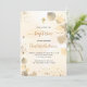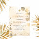 Un arrière - plan doré à l'eau décoré d'eucalyptus dorés et de poussière de parties scintillant en faux or. Personnalisez et le nom des enfants et les détails de la cérémonie. Lettres noires et dorées. Non sexiste. Retour : arrière - plan couleur or