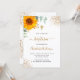 Un arrière - plan blanc décoré d'un tournesol aquarellé, d'une végétation d'eucalyptus et de feuilles dorés et de parties scintillant en faux or tombe. Personnalisez et le nom des enfants et les détails de la cérémonie. Lettres noires et dorées. Non sexiste. Retour : arrière - plan blanc avec gouttes de parties scintillant en faux or