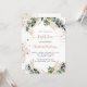 Un arrière - plan blanc décoré de verdure d'eucalyptus et de feuilles dorés et de parties scintillant en faux or tombe. Personnalisez et le nom des enfants et les détails de la cérémonie. Lettres noires et dorées. Retour : arrière - plan blanc avec gouttes de parties scintillant en faux or