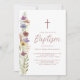 Cette invitation au baptême floral rustique est décorée de fleurs sauvages d'aquarelle, d'élégantes typographies de scénario et d'une croix. Convient pour le baptême d'un bébé garçon ou d'une petite fille. Facile à personnaliser. Aquarelle originale © Michele Davies.