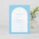 Une invitation de baptême de garçon moderne en forme d'arche, bleue et blanche. Dans la partie supérieure, il y a une croix avec un texte en arc au-dessus. Le prénom est écrit en écriture, au-dessus du deuxième nom. Les informations sur la cérémonie et la réception sont sur deux colonnes séparées par une ligne. Le texte, les lignes et la couleur de l'arche sont bleu bébé, le fond est blanc.