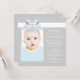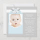 Invitation de baptême photo bébé garçon bleu, gris et blanc adorable. Cette invitation de baptême bébé garçon bleu et gris mignonne est facilement personnalisable pour votre événement en ajoutant votre photo et les détails de l'événement, le style de police, la taille et la couleur de la police, ainsi que le libellé. Veuillez noter que tous les autocollants, cartes et modèles d'invitation que vous trouverez sur Zazzle sont des graphiques imprimés sans véritables bijoux, rubans, reliefs, gaufrés ou pièces ajoutées.