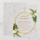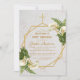 Cette élégante invitation de baptême et de premier anniversaire à motif floral géométrique recommandée pour une fille a un cadre doré irrégulier avec des bouquets de fleurs de lys calla blancs et de fougères en haut à droite et en bas à gauche sur deux hexagones dorés qui se superposent sur un fond en marbre blanc, avec une croix dorée à son sommet. Le nom de l'enfant est écrit dans une élégante écriture calligraphique. Tout le texte est d'une couleur jaune doré, comme le cadre doré.