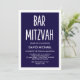 Cette invitation simple pourtant élégante de Mitzvah de barre comporte un arrière - plan de bleu marine avec une frontière blanche, et la typographie blanche moderne.