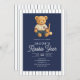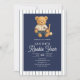 The heading Beary First Birthday stands out in retro calligraphy, bringing a touch of vintage flair that feels both timeless and joyful. Set against a background of navy blue stripes inspired by classic baseball uniforms, this invitation evokes the spirit of the ballpark while maintaining an elegant, polished look.