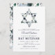 Elégante invitation à la fête de mitzvah avec un simple arrière - plan blanc qui peut être changée en n'importe quelle couleur, une étoile florale bleue de david, et un modèle bat mitzvah moderne facile à personnaliser.