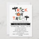 Invitation de fête d'Halloween avec Trick ou Treat écrite au sommet, décorée de chauves-souris, d'un citrouille et d'un fantôme.