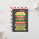 Hamburger empilé unique aux oignons, conserves au vinaigre, laitue, hot-dog, fromage, moutarde, ketchup, sur un arrière - plan de tableau. Un motif rouge de pique-nique de guingan est sur le dos de l'invitation. Votre invité aimera cette invitation unique. Personnaliser avec votre propre texte. Veuillez examiner mon magasin pour assurer plutôt ceci. Illustration originale par le pj_design. Envoyez-moi si vous avez besoin de l'aide. Vous pouvez faire à ceci une plus grande carte en la customisant et en cliquant sur en les options de papier.